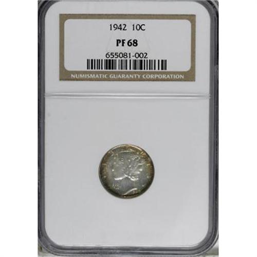 <B>1942 10C PR68 NGC.</B></I> A beautifully toned dime, with the reverse displaying a symphony of lavender, sky-blue, citrine, and tangerine color. The obverse has a simple ring of orange-gold circling the rim, while the center is an elegant pearl color. Boldly struck and highly attractive, with unusually vibrant toning.<BR><BR><B>Coin Engraver:</B> Adolph A. Weinman<BR><BR><b>Shipping:</b> Coins & Currency (<a target="_blank" href="http://www.heritageauctions.com/common/shipping.php">view shipping information</a>)