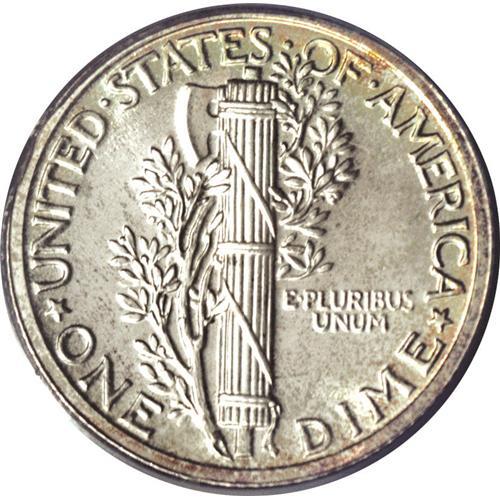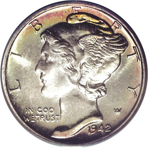 <B>1942<10C> PR68 PCGS.</B></I> An immaculate, deeply mirrored example of this popular final year of issue. Toned primarily on the obverse in hues of lime-gold and lilac-purple. Scarce so fine. Population: 35 in 68, none are finer (7/06).