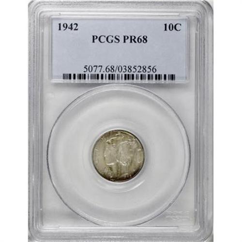 <B>1942 10C PR68 PCGS.</B></I> Proof Mercury dimes had a short production run with low mintages across the board. Even 1942, the year with the highest production, saw only 22,329 pieces leave Philadelphia. This final-year specimen has a hint of bronze at the margins, thickest at the lower obverse, while the remainder of the coin has thin silver-gray patina overall. Sharply impressed, as always, and practically perfect. Population: 37 in 68, 0 finer (1/08).<BR><BR><B>Coin Engraver:</B> Adolph A. Weinman<BR><BR><b>Shipping:</b> Coins & Currency (<a target="_blank" href="http://www.heritageauctions.com/common/shipping.php">view shipping information</a>)