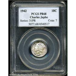 <TABLE cellSpacing=0 cellPadding=0 width="100%" bgColor=#000000 border=0><TBODY><TR><TD width="100%"><TABLE cellSpacing=1 cellPadding=3 width="100%" border=0><TBODY><TR><TD width="100%" bgColor=#79735c><FONT face=arial color=#ffffff size=3><B>Description</B> </FONT></TD></TR><TR><TD width="100%" bgColor=#ffffff><FONT face=arial size=2><B>1942 10C PR68 PCGS.</B></I> Ex: Charles Japhe Collection. The date with the highest mintage in the proof Mercury Dime series, the final-year, 1942 (22,329 pieces produced) is the most plentiful issue in today's market. Precious few survivors, however, are smooth and attractive enough to warrant a PR68 rating at the major grading services. The present Superb Gem is an extraordinary representative whose lightly patinated surfaces display vivid rose-gray toning in most areas. Both sides display a brilliant finish that is most attractive. Free of distracting blemishes, this coin belongs in a specialized collection of Registry Set quality. Population: 27 in 68, 0 finer (8/03). </FONT></TD></TR></TBODY></TABLE></TD></TR></TBODY></TABLE><BR><A name=PricesRealized></A><TABLE cellSpacing=0 cellPadding=0 width="100%" bgColor=#000000 border=0><TBODY><TR><TD width="100%"><TABLE cellSpacing=1 cellPadding=3 width="100%" border=0><TBODY><TR><TD width="100%" bgColor=#79735c><A name=PR><FONT face=arial color=#ffffff size=3><B>Previous Prices from Heritage Auctions</B> </FONT></A></TD></TR><TR><TD bgColor=#f6f6ed><TABLE cellSpacing=0 cellPadding=0 width="100%" border=1><TBODY><TR><TD align=middle width="33%"><B>Date</B></TD><TD align=middle width="33%"><B>Service</B></TD><TD align=middle width="33%"><B>Price</B></TD></TR><TR bgColor=whitesmoke><TD width="33%"><B>09/13/1997</B></TD><TD width="33%">PCGS</TD><TD width="33%">$1,293.75</TD></TR><TR bgColor=whitesmoke><TD width="33%"><B>01/06/1993</B></TD><TD width="33%">PCGS</TD><TD width="33%">$1,980.00</TD></TR><TR bgColor=whitesmoke><TD width="33%"><B>05/03/2003</B></TD><TD width="33%">PCGS</TD><TD width="33%">$2,415.00</TD></TR><TR bgColor=whitesmoke><TD width="33%"><B>04/27/2002</B></TD><TD width="33%">NGC</TD><TD width="33%">$2,012.50</TD></TR><TR bgColor=whitesmoke><TD width="33%"><B>03/18/1998</B></TD><TD width="33%">NGC</TD><TD width="33%">$495.00</TD></TR><TR bgColor=whitesmoke><TD width="33%"><B>02/02/1996</B></TD><TD width="33%">NGC</TD><TD width="33%">$825.00</TD></TR><TR bgColor=whitesmoke><TD width="33%"><B>04/05/2001</B></TD><TD width="33%">PCGS</TD><TD width="33%">$1,897.50</TD></TR><TR bgColor=whitesmoke><TD width="33%"><B>02/01/2000</B></TD><TD width="33%">NGC</TD><TD width="33%">$949.00</TD></TR><TR bgColor=whitesmoke><TD width="33%"><B>03/14/1996</B></TD><TD width="33%">NGC</TD><TD width="33%">$852.50</TD></TR><TR bgColor=whitesmoke><TD width="33%"><B>04/17/2001</B></TD><TD width="33%">NGC</TD><TD width="33%">$975.00</TD></TR></TBODY></TABLE></TD></TR><TR><TD bgColor=#ffffff><FONT face=arial size=1 ?>PLEASE NOTE: All prices realized reflect the final hammer price PLUS the buyer's premium in auctions that charge a buyer's premium. Each item has a notation at the top of the listing indicating whether that lot included a buyer's premium. Example: A item that sells with a final hammer price of $100 and a 20% buyer's premium will display with a price realized of $120. All information listed is intended to be as accurate as possible, but errors are possible. Please use this guide carefully and inform us of any inaccuracies. </FONT></TD></TR></TBODY></TABLE></TD></TR></TBODY></TABLE><BR><TABLE cellSpacing=0 cellPadding=0 width="100%" bgColor=#000000 border=0><TBODY><TR><TD width="100%"><TABLE cellSpacing=1 cellPadding=3 width="100%" border=0><TBODY><TR><TD width="100%" bgColor=#79735c colSpan=6><FONT face=arial color=#ffffff size=3><B>Price Guide*</B> </FONT></TD></TR><TR bgColor=#f6f6ed><TD align=middle><B>Grade</B> </TD><TD align=middle><B>Coin World<BR>(Trends)</B> </TD><TD align=middle><B>Numismedia<BR>Retail</B> </TD><TD align=middle><B>Numismedia<BR>Wholesale</B> </TD><TD align=middle><B>Coin<BR>Universe</B> </TD><TD align=middle><B>Heritage<BR>Value Index</B> </TD></TR><TR bgColor=#ffffff><TD align=middle>67</TD><TD align=right>---</TD><TD align=right>$750.00</TD><TD align=right>$600.00</TD><TD align=right>$875.00</TD><TD align=right>$559.25</TD></TR><TR style="FONT-WEIGHT: bold" bgColor=#cccfdd><TD align=middle>68</TD><TD align=right>---</TD><TD align=right>---</TD><TD align=right>$1,750.00</TD><TD align=right>$3,500.00</TD><TD align=right>$1,584.38</TD></TR><TR bgColor=#ffffff><TD align=middle>69</TD><TD align=right>---</TD><TD align=right>---</TD><TD align=right>---</TD><TD align=right>---</TD><TD align=right>---</TD></TR><TR bgColor=#ffffff><TD colSpan=6><FONT size=1>*All information listed is intended to be as accurate as possible, but errors are possible. No item may be returned or refused based on this information which is provided as a service to our customers. You should contact each pricing source directly to determine the accuracy of this information. </FONT></TD></TR></TBODY></TABLE></TD></TR></TBODY></TABLE><BR><TABLE cellSpacing=0 cellPadding=0 width="100%" bgColor=#000000 border=0><TBODY><TR><TD width="100%"><TABLE cellSpacing=1 cellPadding=3 width="100%" border=0><TBODY><TR><TD width="100%" bgColor=#79735c><FONT face=arial color=#ffffff size=3><B>Population Guide</B> </FONT></TD></TR><TR bgColor=#ffffff><TD align=middle><!-- Begin Output of Population Grid--><TABLE cellSpacing=0 cellPadding=0 width="100%" border=0><TBODY><TR><TD vAlign=center><TABLE cellSpacing=0 width="100%" border=1 cellsadding="3"><TBODY><TR><TD vAlign=center><TABLE cellSpacing=0 cellPadding=3 width="100%" border=1><TBODY><TR><TD vAlign=center align=middle bgColor=#f0f1e8 colSpan=2 <CENTER><FONT face=Arial size=2><B>PCGS Pop </B></FONT><CENTER></CENTER></TD><TD vAlign=center align=middle bgColor=#f0f1e8 colSpan=2><CENTER><FONT face=Arial size=2><B>NGC Pop</B></CENTER></FONT></TD></TR><TR><TD vAlign=center><FONT face=Aria
