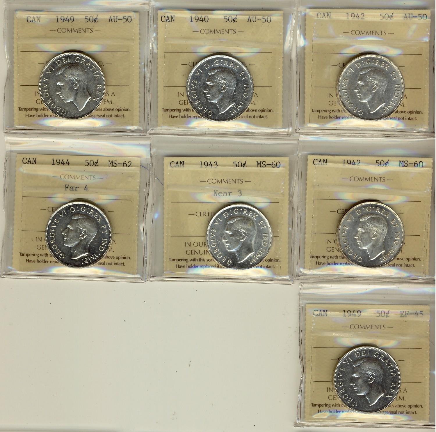 1942, 1940 & 1949 50¢ AU50 with 1942, 1943 Nr3 MS60 & 1944 Fr4 MS62 and 1949 50¢ EF45. Lot of 7 ICCS graded coins.