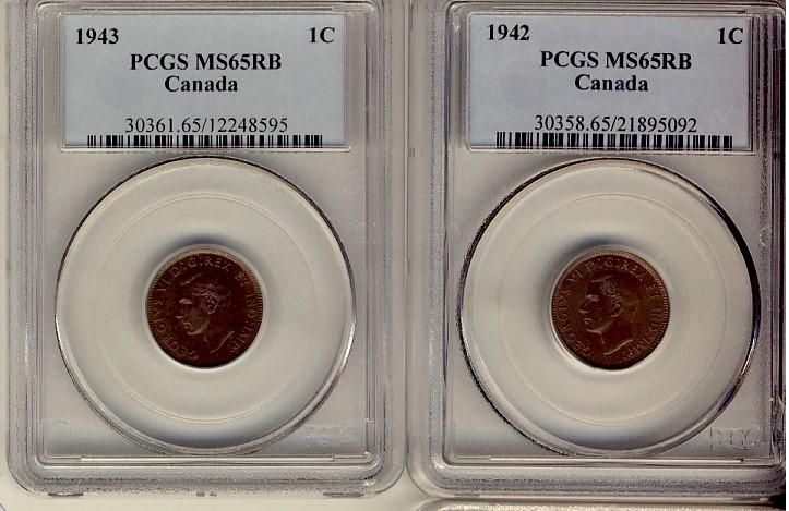 1942 & 1943 1¢ PCGS MS65RB" Lot of 2 coins.