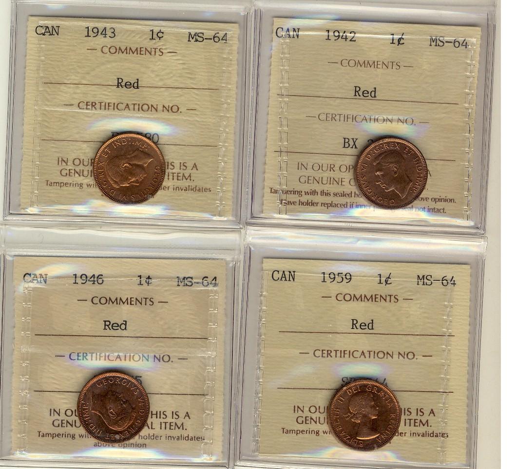 1942, 1943, 1946 Na 1959 1¢ ICCS MS64RD. Lot of 4 coins all