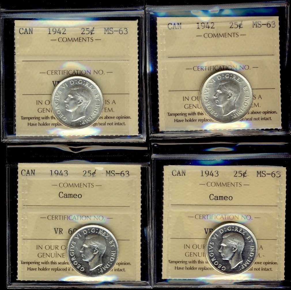 1942 & 1943 25¢ ICCS MS63. Lot of 4 coins, 2 of each date with 43’s designated cameo.