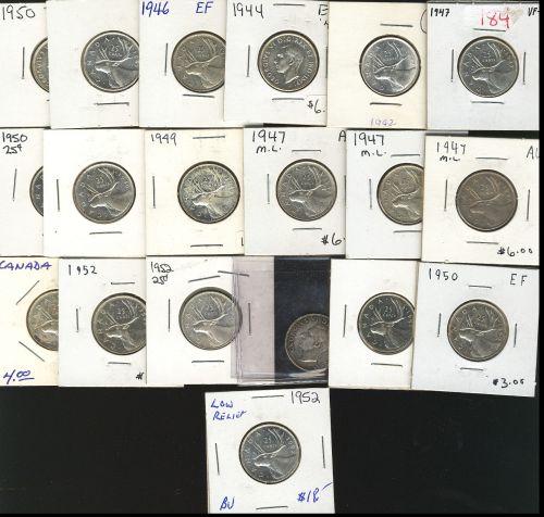 1942, 1944, 1946, 1947 (2), 1947 ML (3), 1949 (2), 1950 (3), 1951 HR, 1952 (5). Lot of 19 pieces. Grades vary from EF-40 to MS-60.