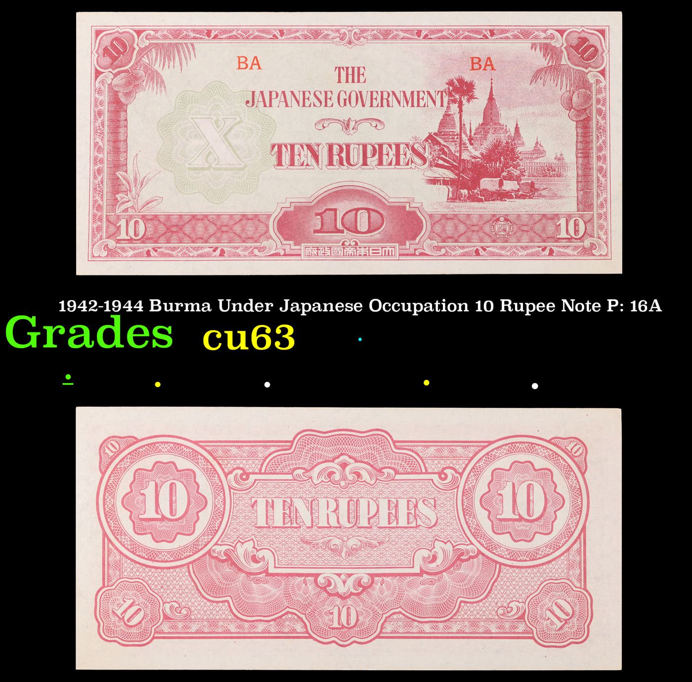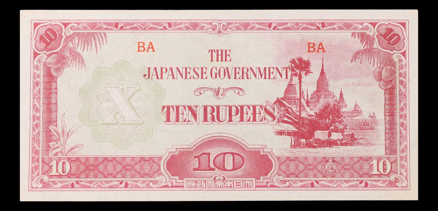 1942-1944 Burma Under Japanese Occupation 10 Rupee Note P: 16A Grades Select CU. Japanese invasion money, officially known as Southern Development Bank Notes (Japanese: ??????? Dai T?-A Sens? gunpy?, "Greater East Asia War military scrip"), was currency issued by the Japanese Military Authority as a replacement for local currency after the conquest of colonies and other states in World War II. Japan printed this currency for many countries, including Malaysia, Singapore, North Borneo, Sarawak, Burma, Brunei, and several Oceania territories controlled by Australia.