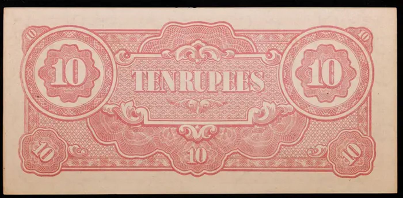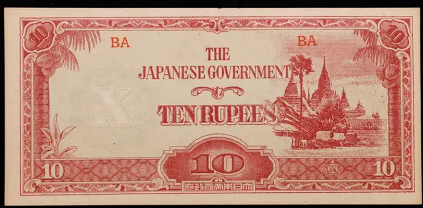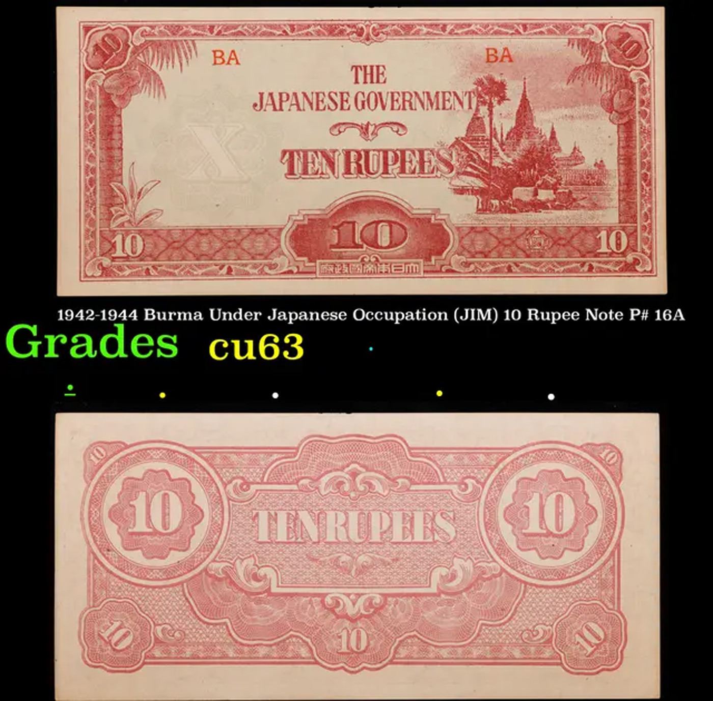 1942-1944 Burma Under Japanese Occupation (JIM) 10 Rupee Note P# 16A Grades Select CU. Japanese invasion money, officially known as Southern Development Bank Notes (Japanese: ??????? Dai T?-A Sens? gunpy?, "Greater East Asia War military scrip"), was currency issued by the Japanese Military Authority as a replacement for local currency after the conquest of colonies and other states in World War II. Japan printed this currency for many countries, including Malaysia, Singapore, North Borneo, Sarawak, Burma, Brunei, and several Oceania territories controlled by Australia.