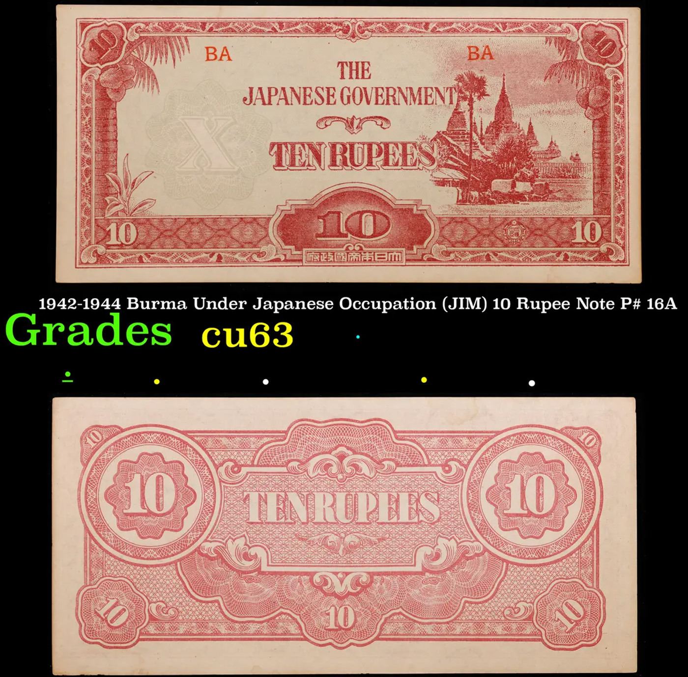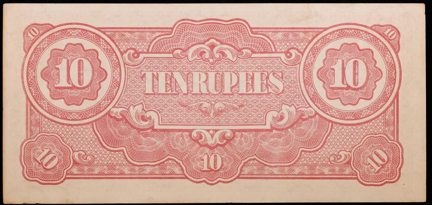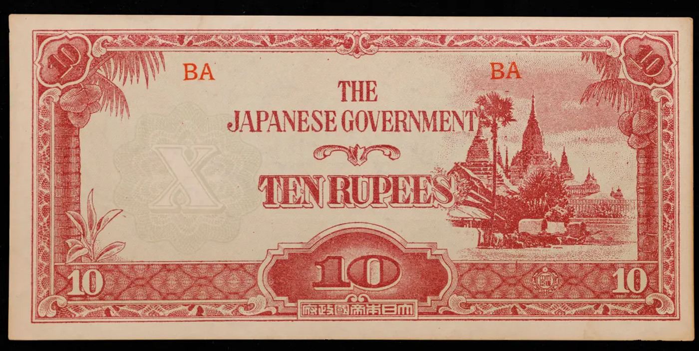 1942-1944 Burma Under Japanese Occupation (JIM) 10 Rupee Note P# 16A Grades Select CU. Japanese invasion money, officially known as Southern Development Bank Notes (Japanese: ??????? Dai T?-A Sens? gunpy?, "Greater East Asia War military scrip"), was currency issued by the Japanese Military Authority as a replacement for local currency after the conquest of colonies and other states in World War II. Japan printed this currency for many countries, including Malaysia, Singapore, North Borneo, Sarawak, Burma, Brunei, and several Oceania territories controlled by Australia.