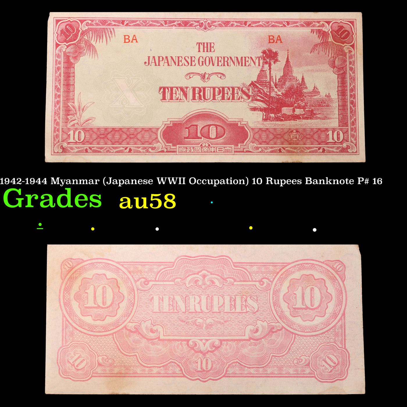 1942-1944 Myanmar (Japanese WWII Occupation) 10 Rupees Banknote P# 16 Grades Choice AU/BU Slider. Japanese invasion money, officially known as Southern Development Bank Notes (Japanese: ??????? Dai T?-A Sens? gunpy?, "Greater East Asia War military scrip"), was currency issued by the Japanese Military Authority as a replacement for local currency after the conquest of colonies and other states in World War II. Japan printed this currency for many countries, including Malaysia, Singapore, North Borneo, Sarawak, Burma, Brunei, and several Oceania territories controlled by Australia. Some Japanese invasion notes are actually counterfeits produced by the American Office of Strategic Services or the British Special Operations Executive, meant to flood and destabilize the economy in the occupied areas, sometimes also including propaganda printed on the notes themselves.