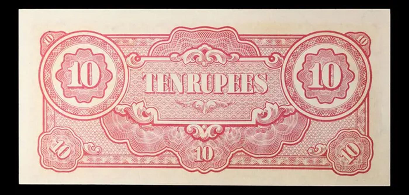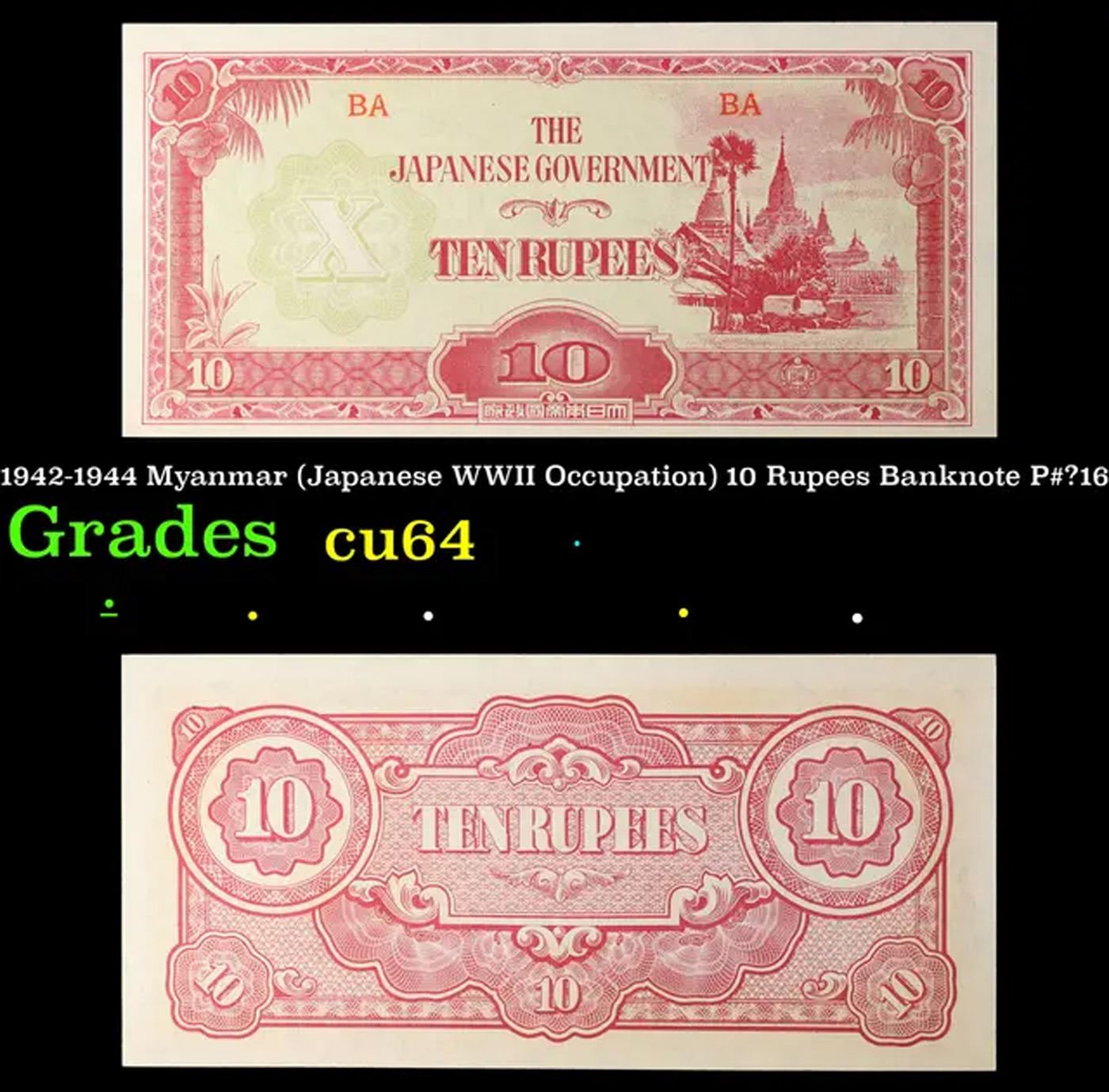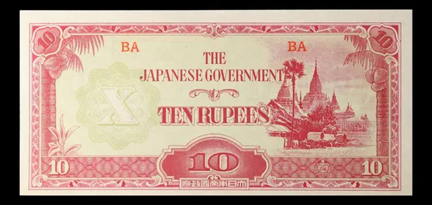 1942-1944 Myanmar (Japanese WWII Occupation) 10 Rupees Banknote P#?16 Grades Choice CU. Japanese invasion money, officially known as Southern Development Bank Notes (Japanese: ??????? Dai T?-A Sens? gunpy?, "Greater East Asia War military scrip"), was currency issued by the Japanese Military Authority as a replacement for local currency after the conquest of colonies and other states in World War II. Japan printed this currency for many countries, including Malaysia, Singapore, North Borneo, Sarawak, Burma, Brunei, and several Oceania territories controlled by Australia. Some Japanese invasion notes are actually counterfeits produced by the American Office of Strategic Services or the British Special Operations Executive, meant to flood and destabilize the economy in the occupied areas, sometimes also including propaganda printed on the notes themselves.