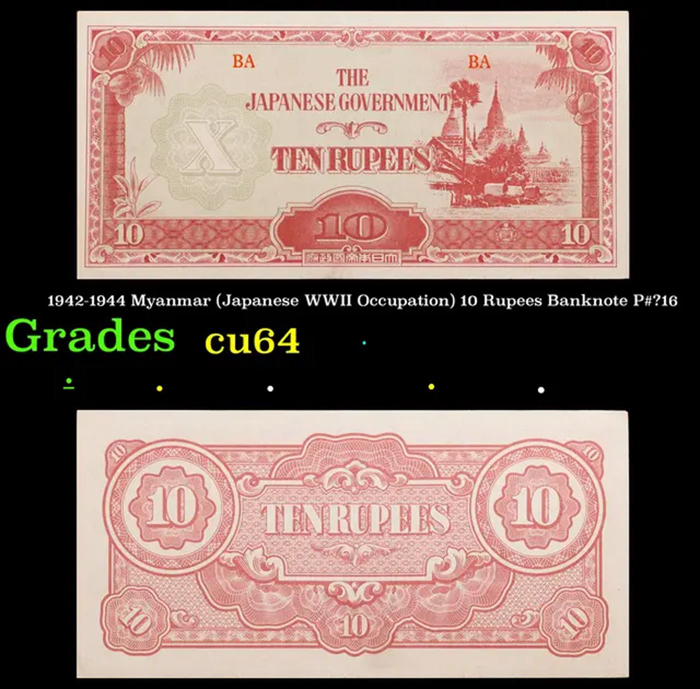 1942-1944 Myanmar (Japanese WWII Occupation) 10 Rupees Banknote P#?16 Grades Choice CU