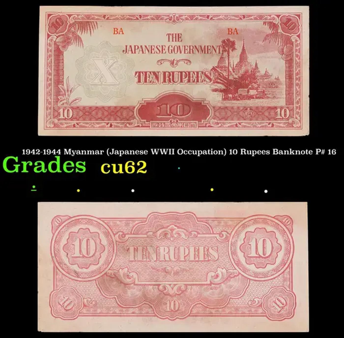 1942-1944 Myanmar (Japanese WWII Occupation) 10 Rupees Banknote P# 16 Grades Select CU