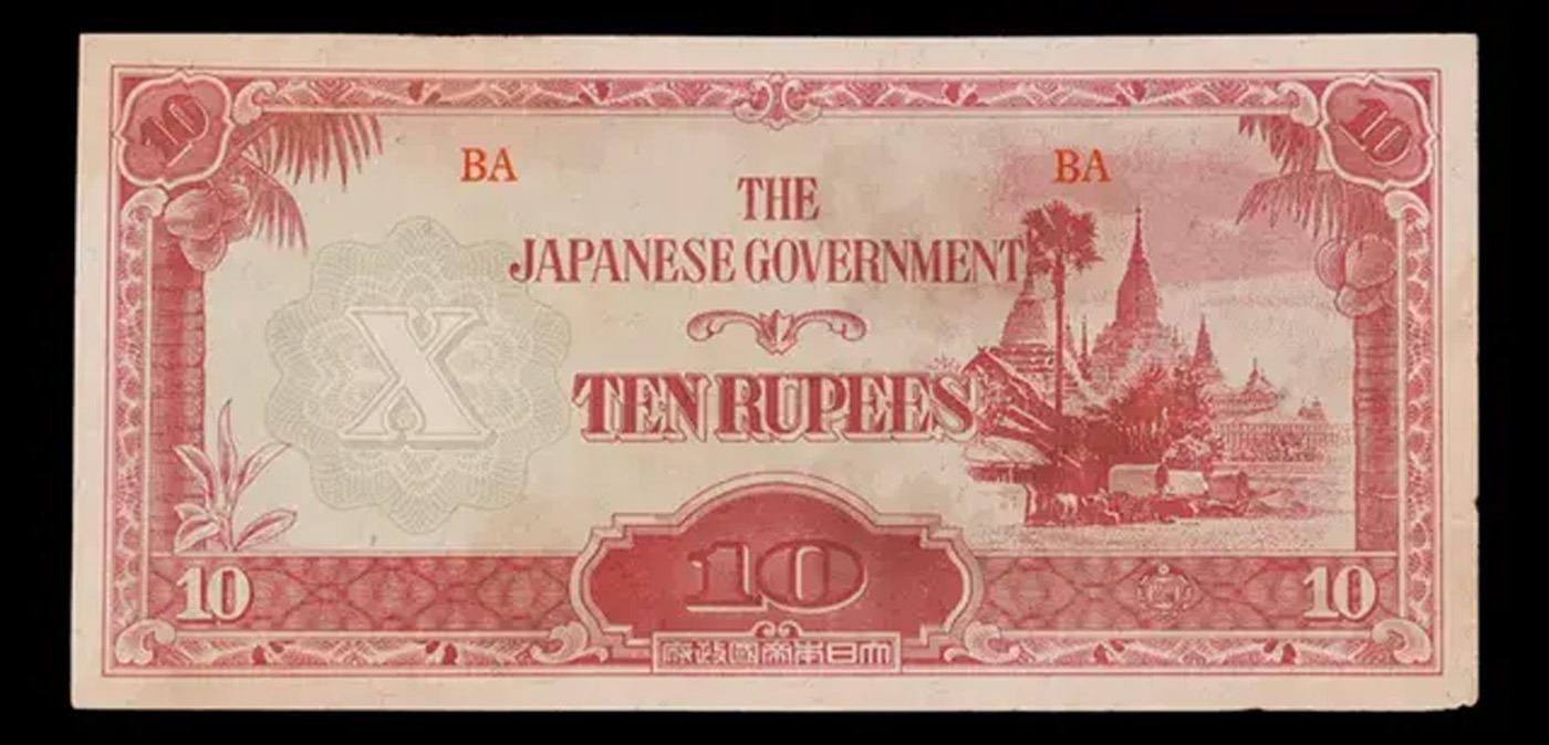 1942-1944 Myanmar (Japanese WWII Occupation) 10 Rupees Banknote P# 16 Grades Select CU. Japanese invasion money, officially known as Southern Development Bank Notes (Japanese: ??????? Dai T?-A Sens? gunpy?, "Greater East Asia War military scrip"), was currency issued by the Japanese Military Authority as a replacement for local currency after the conquest of colonies and other states in World War II. Japan printed this currency for many countries, including Malaysia, Singapore, North Borneo, Sarawak, Burma, Brunei, and several Oceania territories controlled by Australia. Some Japanese invasion notes are actually counterfeits produced by the American Office of Strategic Services or the British Special Operations Executive, meant to flood and destabilize the economy in the occupied areas, sometimes also including propaganda printed on the notes themselves.