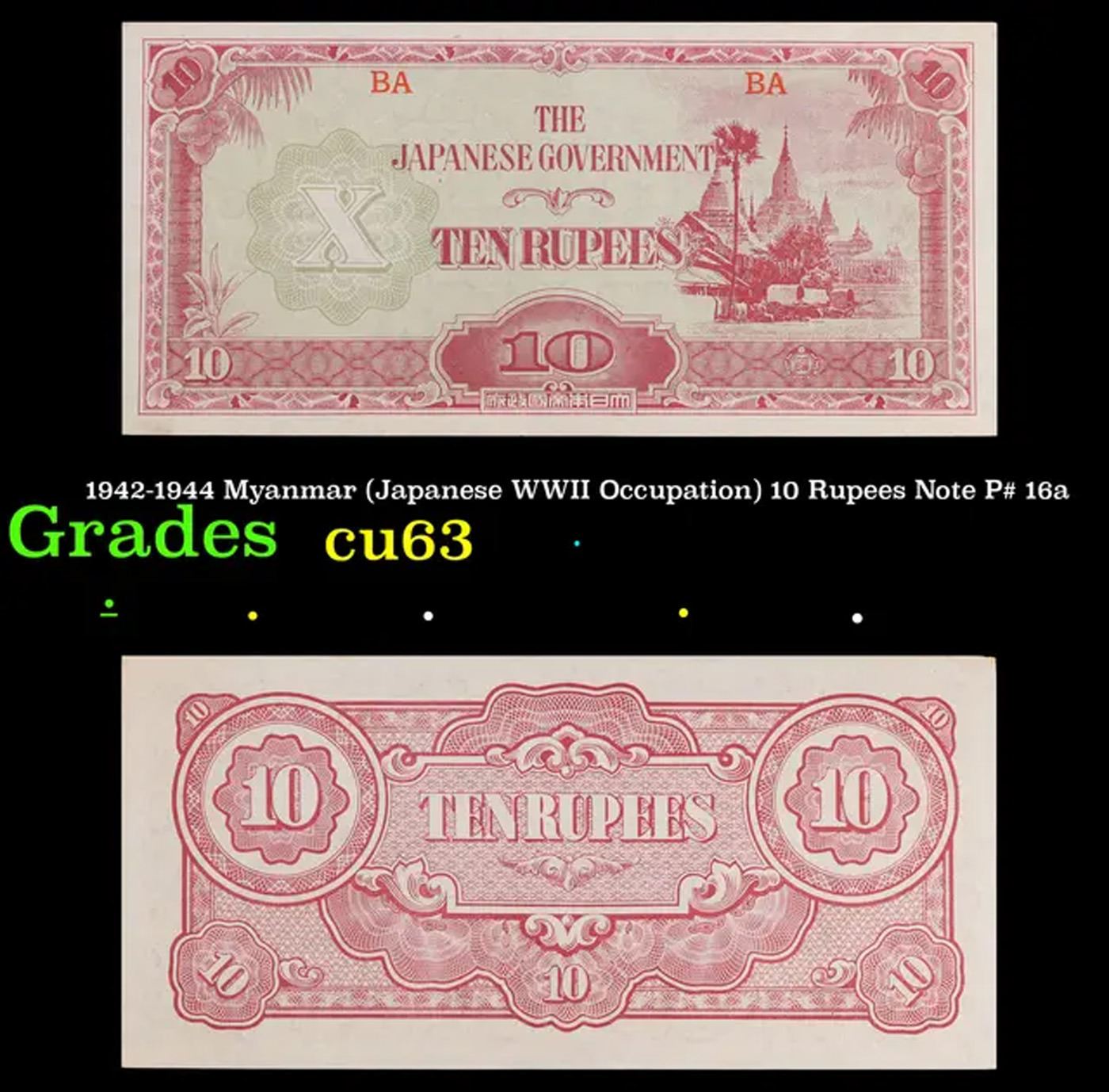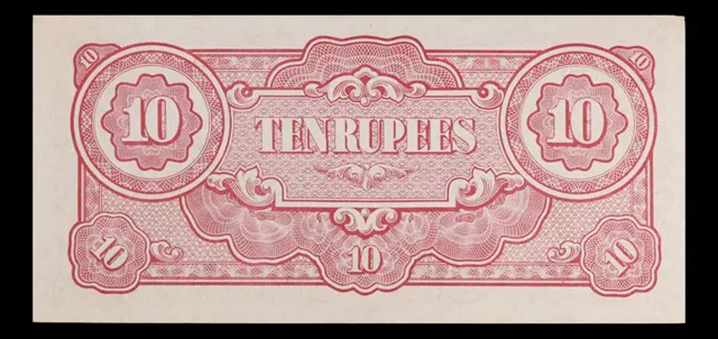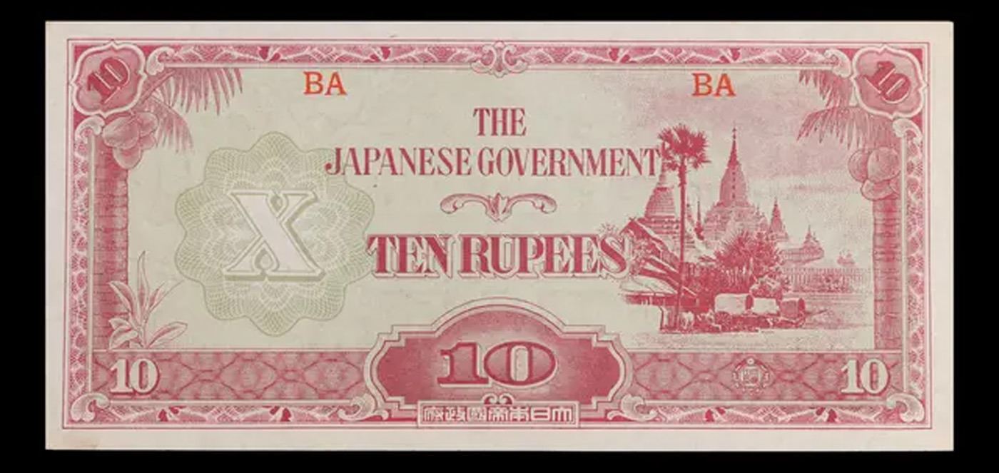 1942-1944 Myanmar (Japanese WWII Occupation) 10 Rupees Note P# 16a Grades Select CU. Japanese invasion money, officially known as Southern Development Bank Notes (Japanese: ??????? Dai T?-A Sens? gunpy?, "Greater East Asia War military scrip"), was currency issued by the Japanese Military Authority as a replacement for local currency after the conquest of colonies and other states in World War II. Japan printed this currency for many countries, including Malaysia, Singapore, North Borneo, Sarawak, Burma, Brunei, and several Oceania territories controlled by Australia. Some Japanese invasion notes are actually counterfeits produced by the American Office of Strategic Services or the British Special Operations Executive, meant to flood and destabilize the economy in the occupied areas, sometimes also including propaganda printed on the notes themselves.