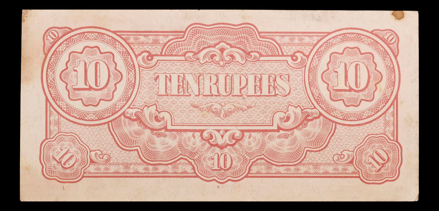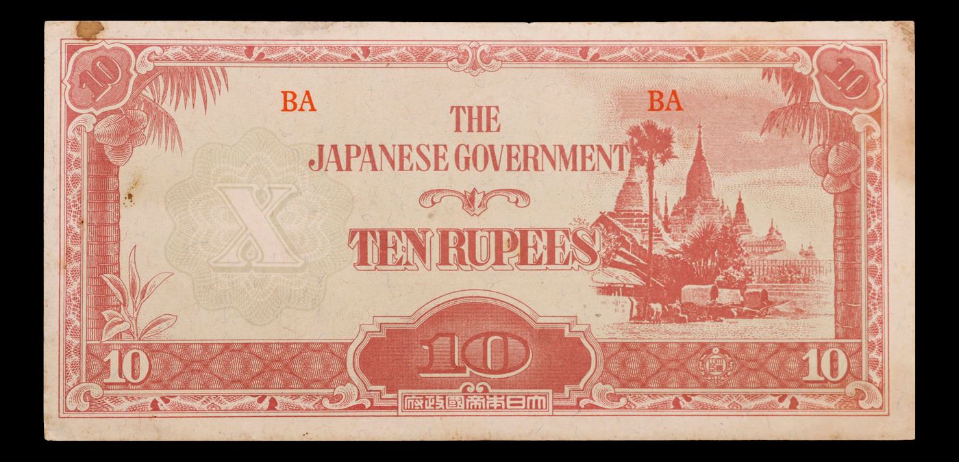 1942-1944 Myanmar Japanese WWII Occupation 10 Rupees Note P# 16b Grades Select CU. Japanese invasion money, officially known as Southern Development Bank Notes (Japanese: ??????? Dai T?-A Sens? gunpy?, "Greater East Asia War military scrip"), was currency issued by the Japanese Military Authority as a replacement for local currency after the conquest of colonies and other states in World War II. Japan printed this currency for many countries, including Malaysia, Singapore, North Borneo, Sarawak, Burma, Brunei, and several Oceania territories controlled by Australia. Some Japanese invasion notes are actually counterfeits produced by the American Office of Strategic Services or the British Special Operations Executive, meant to flood and destabilize the economy in the occupied areas, sometimes also including propaganda printed on the notes themselves.