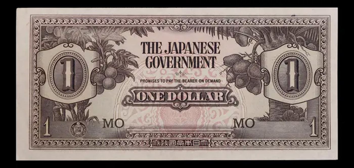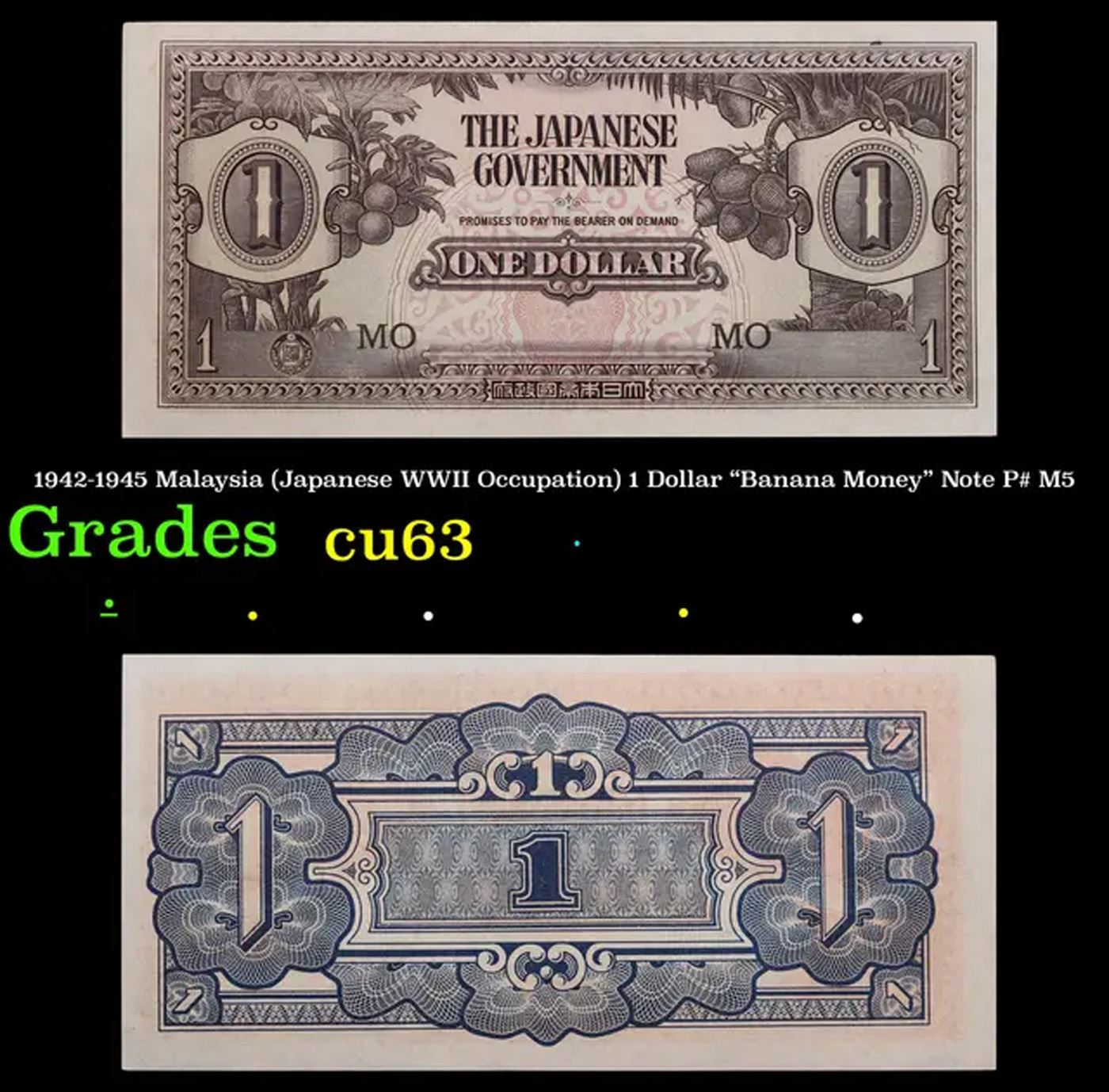 1942-1945 Malaysia (Japanese WWII Occupation) 1 Dollar "Banana Money" Note P# M5 Grades Select CU. After Japanese forces occupied Malaya early in 1942, they introduced new currency notes. Because the $10 note carried a picture of a banana plant, the wartime currency was referred to as banana money. For the first two years of the occupation, the Japanese maintained monetary discipline and kept circulation of this currency under control. However, with the country’s trading economy at a standstill, there was little to tax and, in order to fund the civil administration and purchase supplies for the military, the Japanese began printing more and more money. In December 1940, the active circulation of currency in Malaya was 120 million dollars. By the middle of 1945, the Japanese may have printed 4,000 million dollars, and the active circulation was 30 times greater than before the war. The predictable result was hyperinflation.