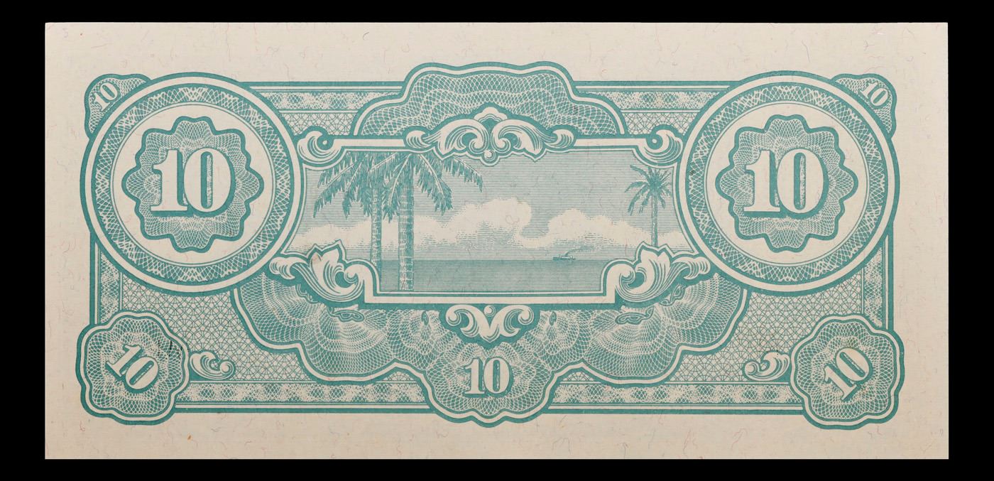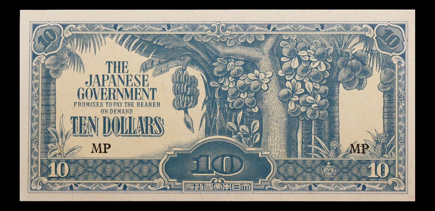 1942-1945 Malaysia (Japanese WWII Occupation) 10 Dollars "Banana Money" Banknote P# M7 Grades Select CU. After Japanese forces occupied Malaya early in 1942, they introduced new currency notes. Because the $10 note carried a picture of a banana plant, the wartime currency was referred to as banana money. For the first two years of the occupation, the Japanese maintained monetary discipline and kept circulation of this currency under control. However, with the country’s trading economy at a standstill, there was little to tax and, in order to fund the civil administration and purchase supplies for the military, the Japanese began printing more and more money. In December 1940, the active circulation of currency in Malaya was 120 million dollars. By the middle of 1945, the Japanese may have printed 4,000 million dollars, and the active circulation was 30 times greater than before the war. The predictable result was hyperinflation.