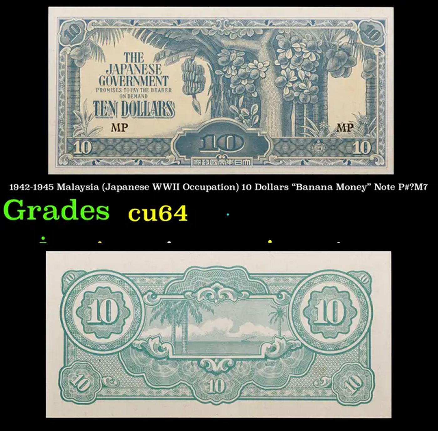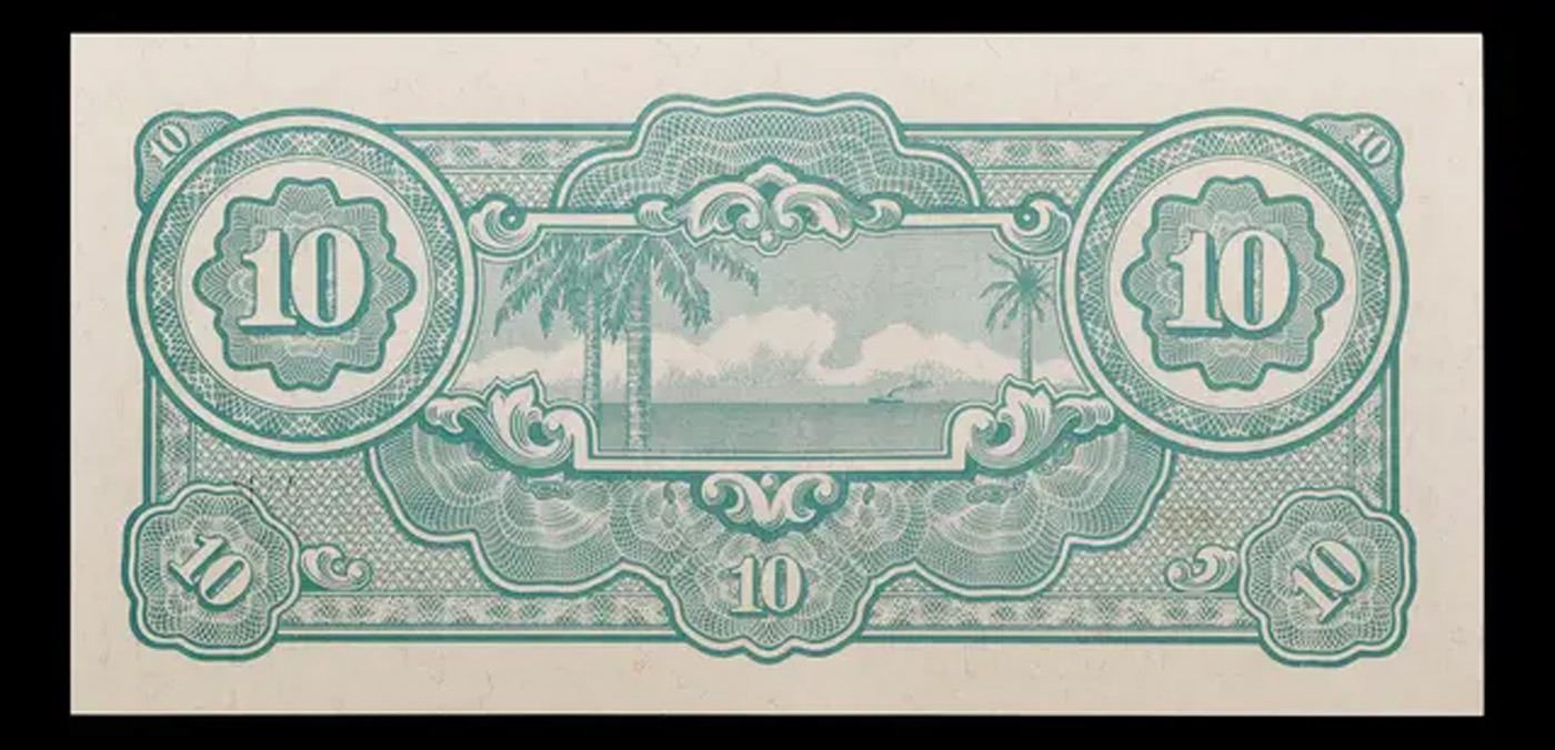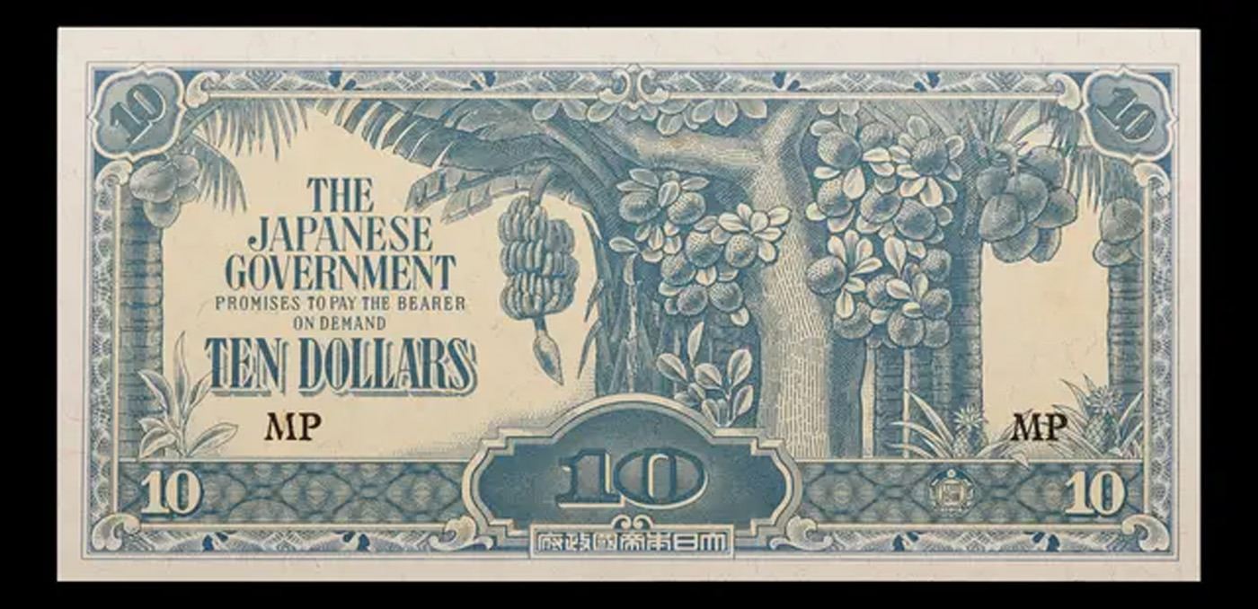 1942-1945 Malaysia (Japanese WWII Occupation) 10 Dollars "Banana Money" Note P#?M7 Grades Choice CU. After Japanese forces occupied Malaya early in 1942, they introduced new currency notes. Because the $10 note carried a picture of a banana plant, the wartime currency was referred to as banana money. For the first two years of the occupation, the Japanese maintained monetary discipline and kept circulation of this currency under control. However, with the country’s trading economy at a standstill, there was little to tax and, in order to fund the civil administration and purchase supplies for the military, the Japanese began printing more and more money. In December 1940, the active circulation of currency in Malaya was 120 million dollars. By the middle of 1945, the Japanese may have printed 4,000 million dollars, and the active circulation was 30 times greater than before the war. The predictable result was hyperinflation.
