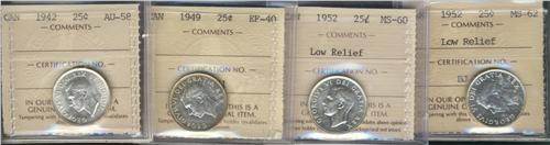 1942, 1949, 1952 LR x 2 25¢. Lot of four coins all ICCS certified and no comments. 1942 AU58, 1949 EF40, 1952 low relief MS60 and MS62