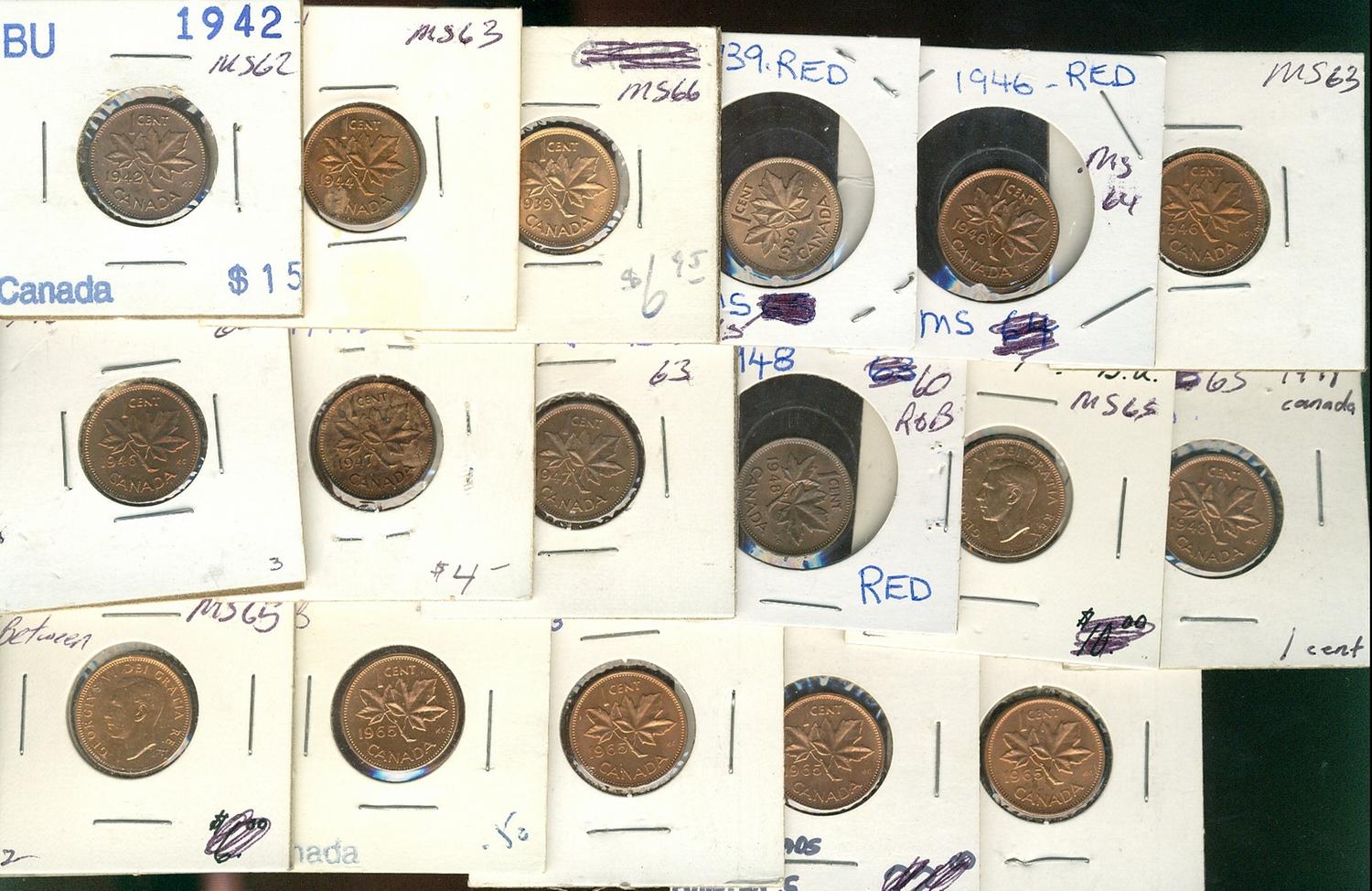 1942-1965 1¢. Lot of 17 coins all MS red/brown to red. Inclludes 1942, 1944, 1939(2), 1946(3), 1947 ML(2), 1948(3), 1949 A To & 1965(4 types). Should be viewed.