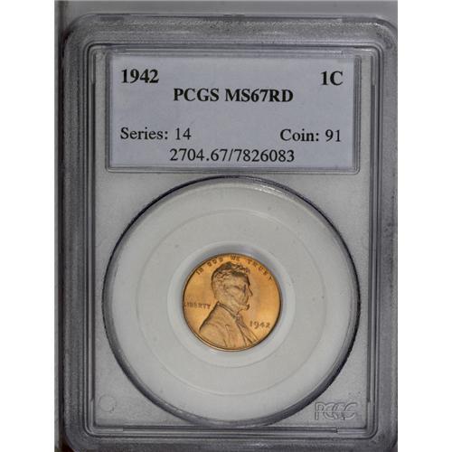 <B>1942<1C> MS67 Red PCGS.</B></I> An immaculate coin that shows bright orange-red color. Outstanding color and overall surfaces.<BR><I>From The Tigard Oregon Small Cent Collection.</B></I>