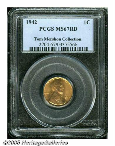 <B>1942<1C> MS67 Red PCGS.</B></I> Brilliant golden luster and a bold strike. This one looks like it was recently removed from an original roll.<BR><I>From The Tom Mershon #2 All-Time PCGS Registry Set of Lincoln Wheat Cents.</B></I>