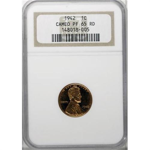 <B>1942 1C PR65 Red Cameo NGC.</B></I> The flashy honey-gold fields compare with the radiant devices. Glimpses of olive and rose-red are also present. Infrequent minor flecks require a glass to see. Census: 18 in 65 Red Cameo, 12 finer (1/08).<BR><BR><b>Shipping:</b> Coins & Currency (<a target="_blank" href="http://www.heritageauctions.com/common/shipping.php">view shipping information</a>)