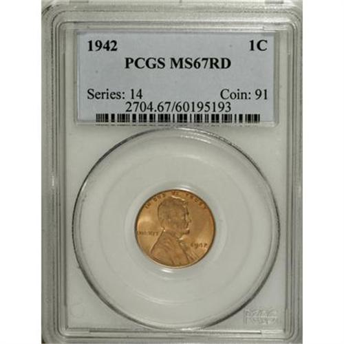 <B>1942 1C MS67 Red PCGS.</B></I> PCGS Population (104/0). NGC Census: (307/0). Mintage: 657,828,608. Numismedia Wsl. Price for NGC/PCGS coin in MS67: $110. (#2704)<BR><BR><B>Coin Engraver:</B> Victor D. Brenner<BR><BR><b>Shipping:</b> Coins & Currency (<a target="_blank" href="http://www.heritageauctions.com/common/shipping.php">view shipping information</a>)