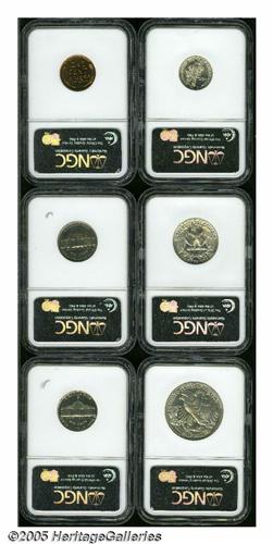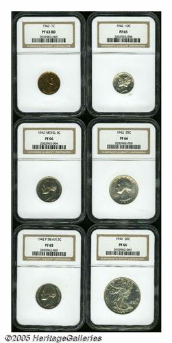 <B>1942<1C> Six-Piece Proof Set PR63 to PR66 NGC.</B></I> The set includes: <B>Cent PR63 Red,</B></I> bright peach color, a few tiny carbon flecks; <B>Type One Nickel PR66,</B></I> dusky apricot and powder-blue color; <B>Type Two Nickel PR65,</B></I> light gold toning, a mint-made lamination near the R in LIBERTY; <B>Dime PR65,</B></I> razor-sharp and close to brilliant; <B>Quarter PR66,</B></I> crisply struck, only faintly toned; and a <B>Half Dollar PR66,</B></I> a boldly impressed and undisturbed premium Gem with a hint of contrast between the devices and field.