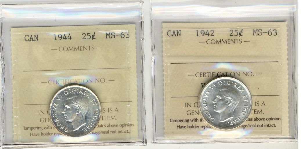 1942 25¢ & 1944 ICCS MS63. Lot of 2 coins.