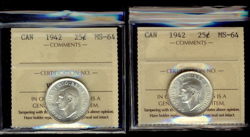 1942 25¢ ICCS MS64. Lot of 2 blast white coins.
