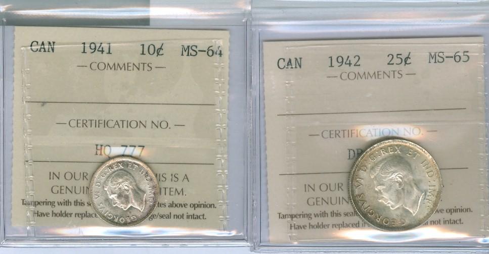 1942 25¢ ICCS MS65. A gem example. Lot of two coins, including a 1941 10¢ MS64.