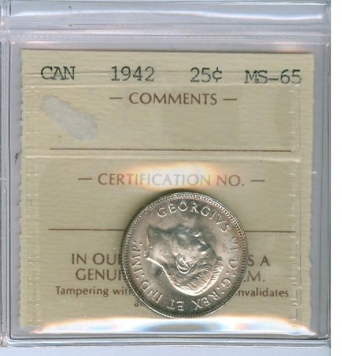 1942 25¢ ICCS MS65. Frostly with light rim tone.