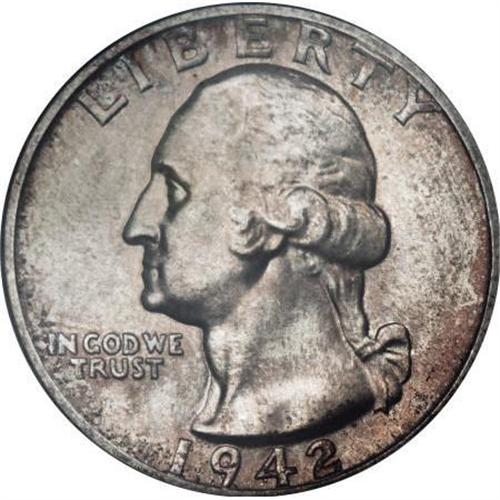 <B>1942 25C MS66 NGC.</B></I> FS-801, formerly FS-014. The prominent die doubling is widest on UNITED STATES OF AMERICA. FS-801 is often confused with another dramatic doubled die reverse 1942 variety, FS-802, which shows broad die doubling on the denomination. Speckled golden and violet toning strengthens about the margins. NGC FS-801 Census: 2 in 66, none finer (12/07).<BR><BR><B>Coin Engraver:</B> John Flanagan<BR><BR><b>Shipping:</b> Coins & Currency (<a target="_blank" href="http://www.heritageauctions.com/common/shipping.php">view shipping information</a>)