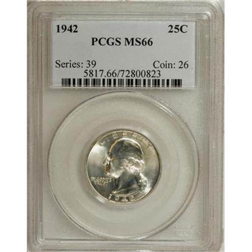 <B>1942 25C MS66 PCGS.</B></I> PCGS Population (185/22). NGC Census: (340/87). Mintage: 102,117,120. Numismedia Wsl. Price for NGC/PCGS coin in MS66: $90. (#5817)<BR><BR><B>Coin Engraver:</B> John Flanagan<BR><BR><b>Shipping:</b> Coins & Currency (<a target="_blank" href="http://www.heritageauctions.com/common/shipping.php">view shipping information</a>)