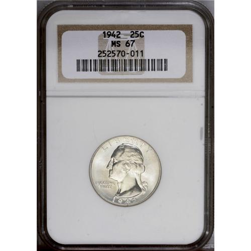 <B>1942<25C> MS67 NGC.</B></I> Boldly struck if slightly weak on a few peripheral letters, with bright, pleasingly full satiny luster. Delicate rainbow colors appear at the obverse borders. The expertly preserved surfaces are nearly immaculate. None have been graded any finer, by NGC (1/06).