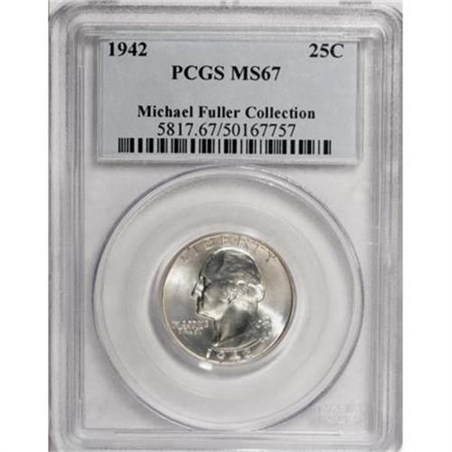 <B>1942 25C MS67 PCGS.</B></I> As is the case with the other silver denominations of this Philadelphia date, the 1942 quarter is collectible in better Mint State grades. The Superb example offered here, however, is clearly finer than typical Choice to Gem survivor, being essentially brilliant with radiant luster and virtually no marks. Population: 22 in 67, 0 finer (10/07).<BR><I>From The Michael Fuller Collection.</B></I><BR><BR><B>Coin Engraver:</B> John Flanagan<BR><BR><b>Shipping:</b> Coins & Currency (<a target="_blank" href="http://www.heritageauctions.com/common/shipping.php">view shipping information</a>)