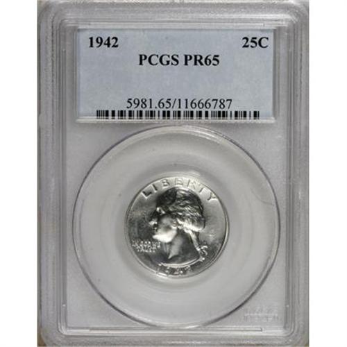 <B>1942 25C PR65 PCGS.</B></I> PCGS Population (1204/1056). NGC Census: (516/785). Mintage: 21,123. Numismedia Wsl. Price for NGC/PCGS coin in PR65: $124. (#5981)<BR><BR><B>Coin Engraver:</B> John Flanagan<BR><BR><b>Shipping:</b> Coins & Currency (<a target="_blank" href="http://www.heritageauctions.com/common/shipping.php">view shipping information</a>\)