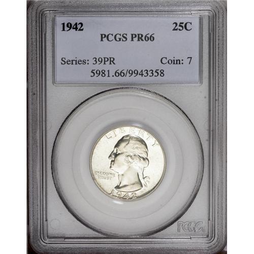 <B>1942<25C> PR66 PCGS.</B></I> A thin veil of champagne-gold color delicately clings to bright Proof surfaces that are well preserved. Sharply struck on the design elements. Numerous die striations are visible on the obverse portrait.