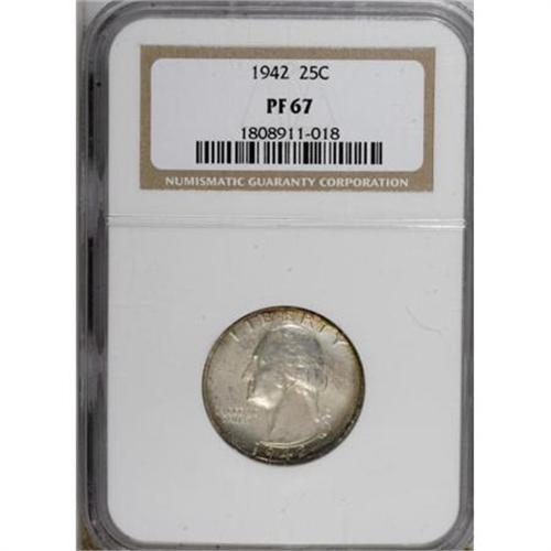 <B>1942 25C PR67 NGC.</B></I> NGC Census: (173/17). PCGS Population (153/5). Mintage: 21,123. Numismedia Wsl. Price for NGC/PCGS coin in PR67: $316. (#5981)<BR><BR><B>Coin Engraver:</B> John Flanagan<BR><BR><b>Shipping:</b> Coins & Currency (<a target="_blank" href="http://www.heritageauctions.com/common/shipping.php">view shipping information</a>)