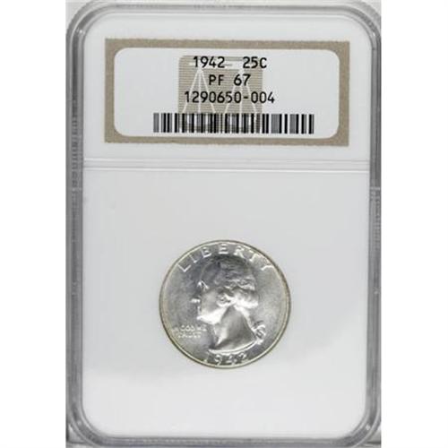 <B>1942 25C PR67 NGC.</B></I> NGC Census: (187/18). PCGS Population (153/5). Mintage: 21,123. Numismedia Wsl. Price for NGC/PCGS coin in PR67: $316. (#5981)<BR><BR><B>Coin Engraver:</B> John Flanagan<BR><BR><b>Shipping:</b> Coins & Currency (<a target="_blank" href="http://www.heritageauctions.com/common/shipping.php">view shipping information</a>)