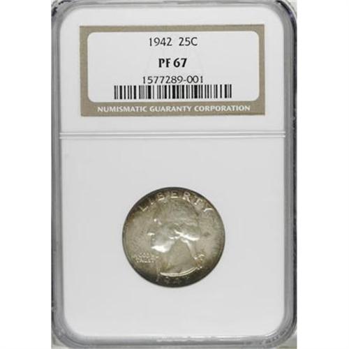<B>1942 25C PR67 NGC.</B></I> . NGC Census: (187/18). PCGS Population (153/5). Mintage: 21,123. Numismedia Wsl. Price for NGC/PCGS coin in PR67: $300. (#5981)<BR><BR><B>Coin Engraver:</B> John Flanagan<BR><BR><b>Shipping:</b> Coins & Currency (<a target="_blank" href="http://www.heritageauctions.com/common/shipping.php">view shipping information</a>)