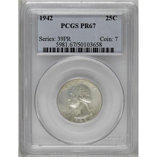 <B>1942<25C> PR67 PCGS.</B></I> Sky-blue and creamy-beige colors enrich this exquisitely struck and gorgeously preserved Superb Gem. The coinage demands of World War II interrupted proof production at the Philadelphia Mint, which did not resume until 1950.<BR><I>From The Alex & Nan Registry Sets.</B></I>