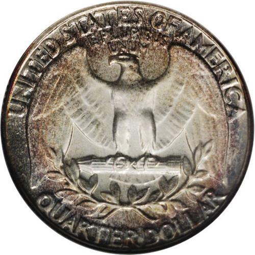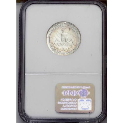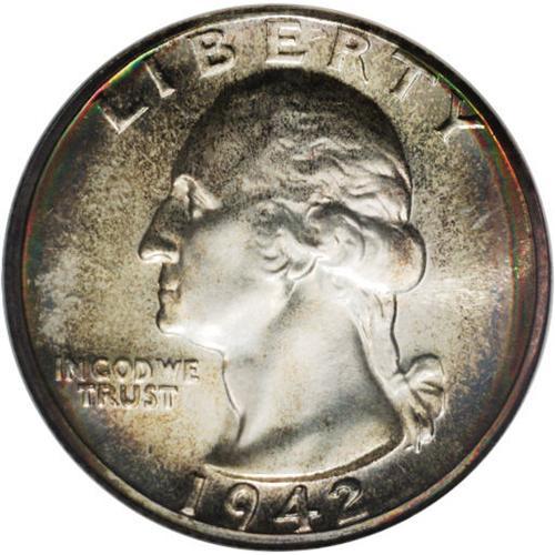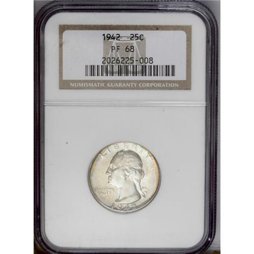 <B>1942<25C> PR68 NGC.</B></I> A proof 1942 Washington quarter of singular beauty, this originally preserved Superb Gem really needs to be seen to be fully appreciated. The peripherally toned obverse and reverse are overlaid in pastel tinged gold, powder-blue, jade-green and crimson-red hues. Otherwise, the centers are a smoky-gray in sheen. There are no distractions to report, and the strike is expectantly full for a proof from this era. Census: 15 in 68, 1 finer (4/06).