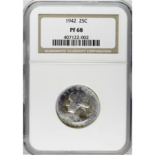 <B>1942 25C PR68 NGC.</B></I> Crisply struck with just a hint of haze over the shining surfaces. An exceptional specimen with hardly any flaws visible to the unaided eye. Census: 15 in 68, 1 finer (1/07).<BR><BR><b>Shipping:</b> Coins & Currency (<a target="_blank" href="http://www.heritageauctions.com/common/shipping.php">view shipping information</a>)