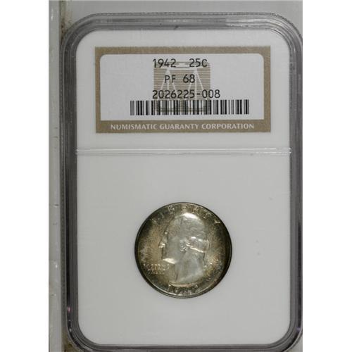 <B>1942 25C PR68 NGC.</B></I> The peripherally toned obverse and reverse have gold, powder-blue, jade-green, and crimson-red hues. The centers are smoke-gray. There are no distractions to report, and the strike is superlative. Census: 16 in 68, 1 finer (10/06).<BR><BR><b>Shipping:</b> Coin/Currency (<a target="_blank" href="http://www.heritageauctions.com/common/shipping.php">view shipping information</a>)