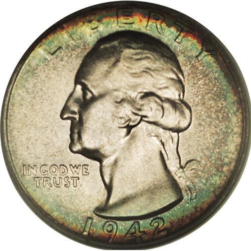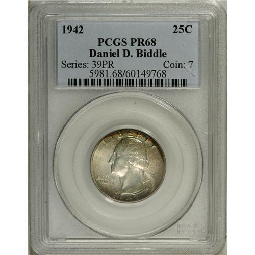 <B>1942 25C PR68 PCGS.</B></I> Ex: Daniel D. Biddle. Golden-brown and powder-blue hues grace the borders of this seemingly immaculate Superb Gem. The fields have satiny luster but are also mildly reflective. The pre-1950s proofs had minute mintages by today's standards, and although the 1942 issue is the most available among the early proofs, improper storage and handling has reduced pristine survivors to a mere handful. Population: 5 in 68, 0 finer (11/06).<BR><BR><b>Shipping:</b> Coin/Currency (<a target="_blank" href="http://www.heritageauctions.com/common/shipping.php">view shipping information</a>)