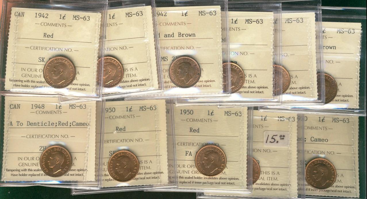 1942(3), 1943(2), 1946, 1947, 1948 A to & 1950(4) ICCS MS63. Lot of 12 coins mostly Red and a couple with Cameo.