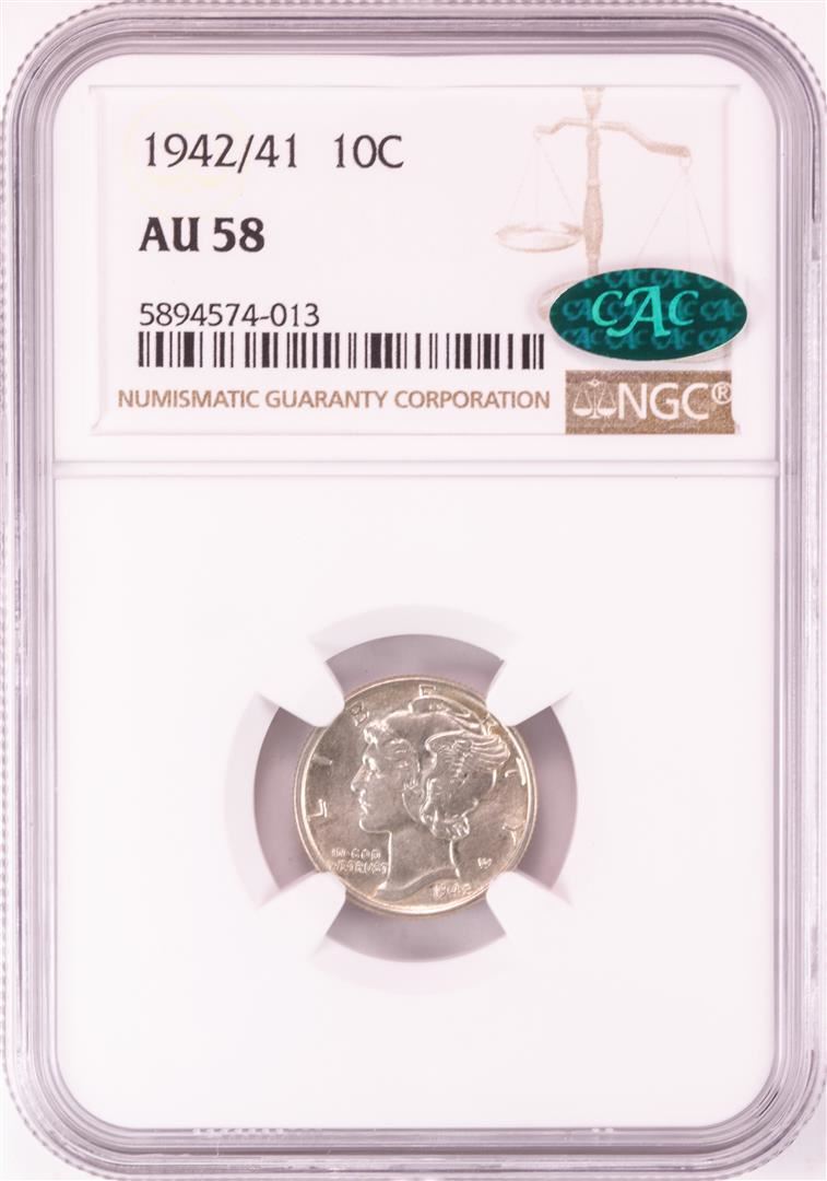One 1942/41 Mercury Dime Coin NGC AU58 CAC. NGC Certified.