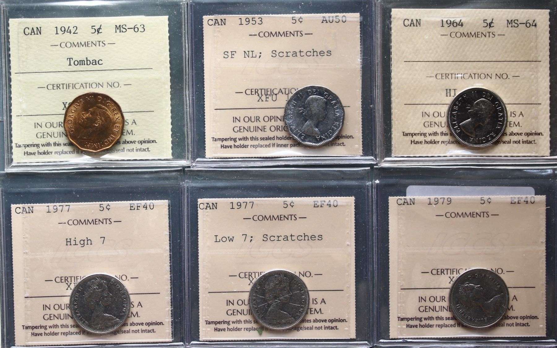1942 5¢, 1953 SF NL, 1964, 1977 Highm 1977 Low & 1979. Lot of 6 ICCS graded coins Extra Fine-40 to